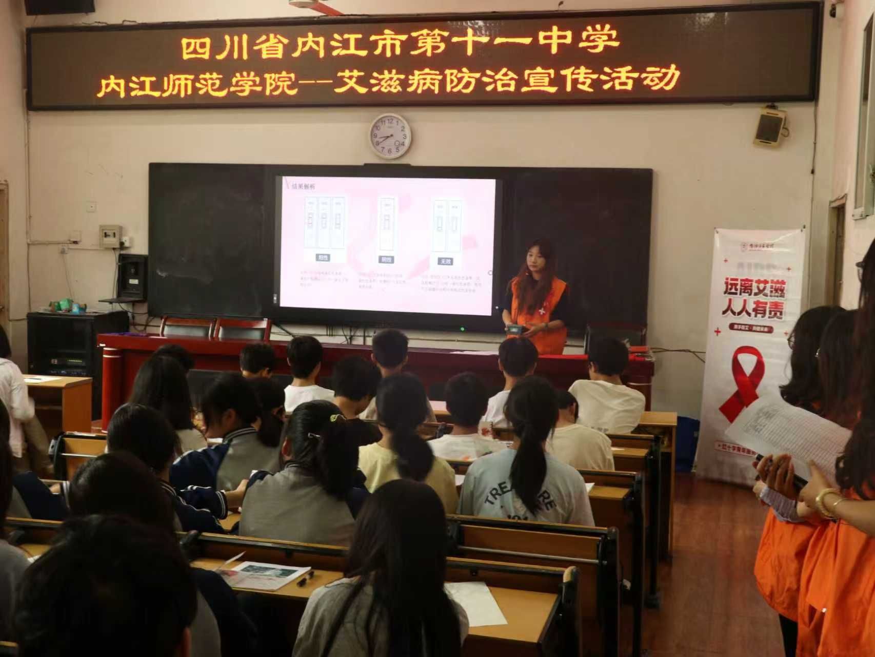 6月25日,团队首站走进内江市第十一中学,打造沉浸式防艾课堂。通过PPT演示、动画短片等形式,生动讲解艾滋病传播途径、预防措施及相关法规。现场设置知识抢答环节,同学们围绕日常接触传播、自我保护等问题踊跃参与。团队还向学生发放防艾宣传手册与“健康书签”,增强互动与记忆。